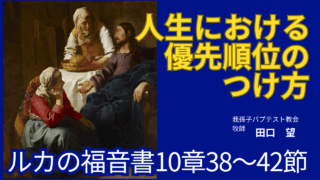 説教 ルカの福音書10章38~42節 人生における優先順位の付け方 マルタのマリアの姉妹は対照的な姉妹でマルタは給仕、応接に手一杯でした。イエス様へのもてなしを何もしないマリアにマルタは腹を立てて、マリアを注意しないイエス様にまで小言をいいます。イエス様は注意されるべきはマルタであるために優しく、しかし、否定を許さない形で2回呼びかけて「マルタ、マルタ、あなたは多くのことに思い悩み、心を乱している。 しかし、必要なことはただ一つだけである。マリアは良い方を選んだ。それを取り上げてはならない。」とおっしゃいました。 2024.10.20 説教